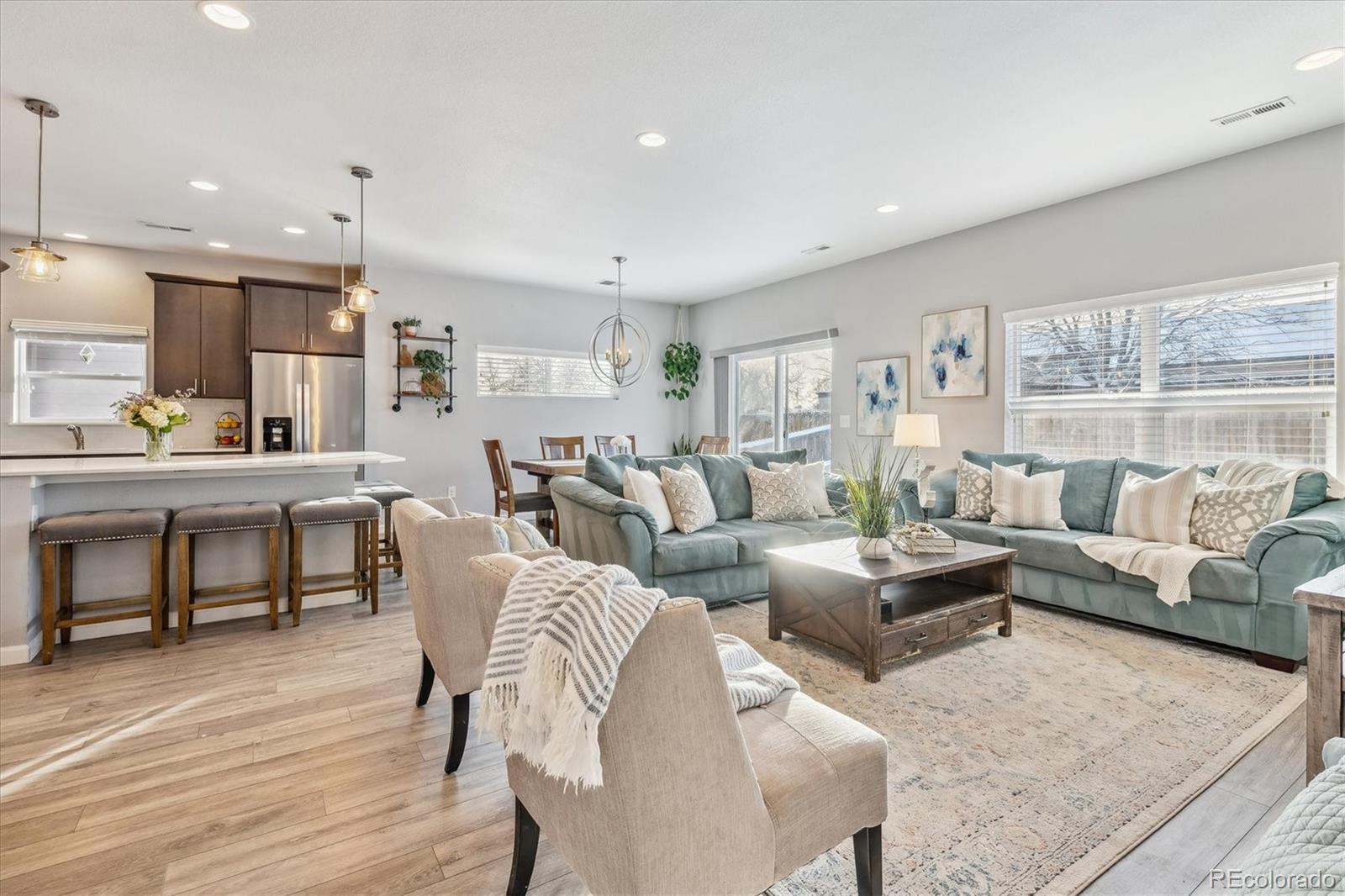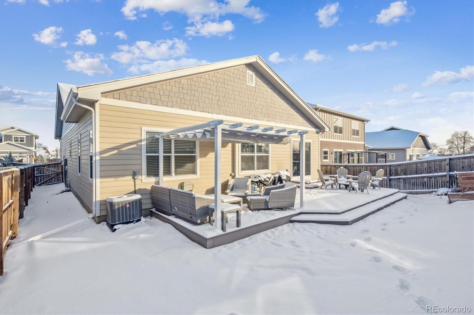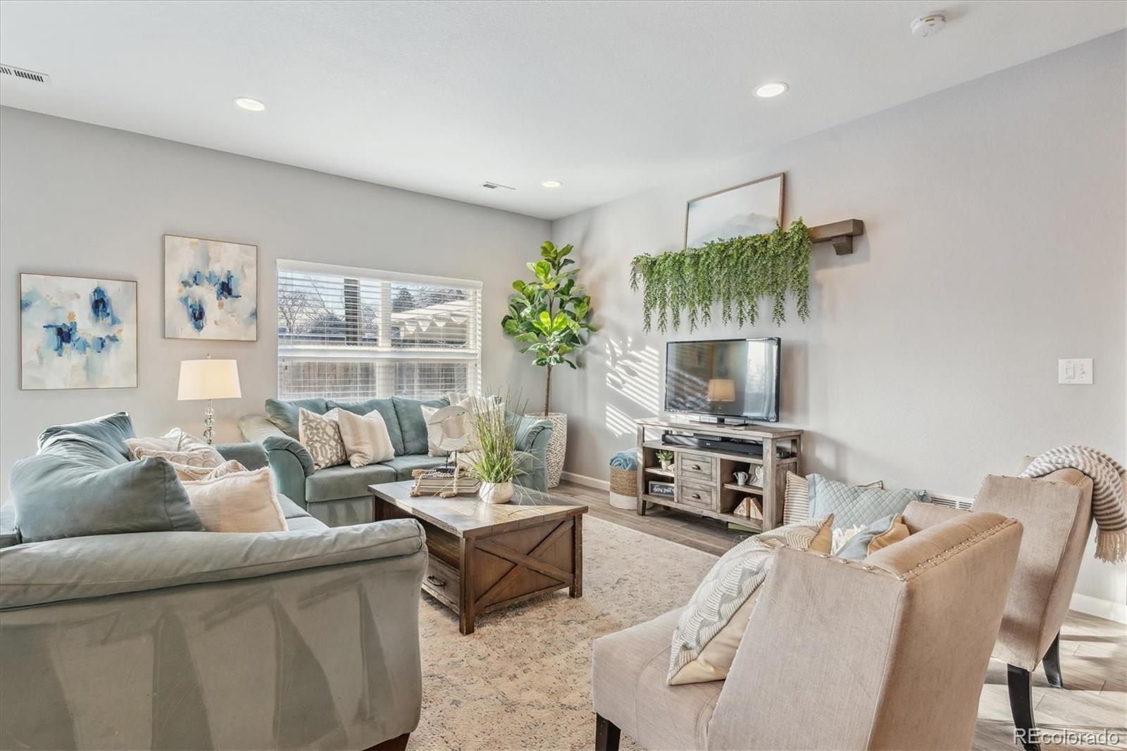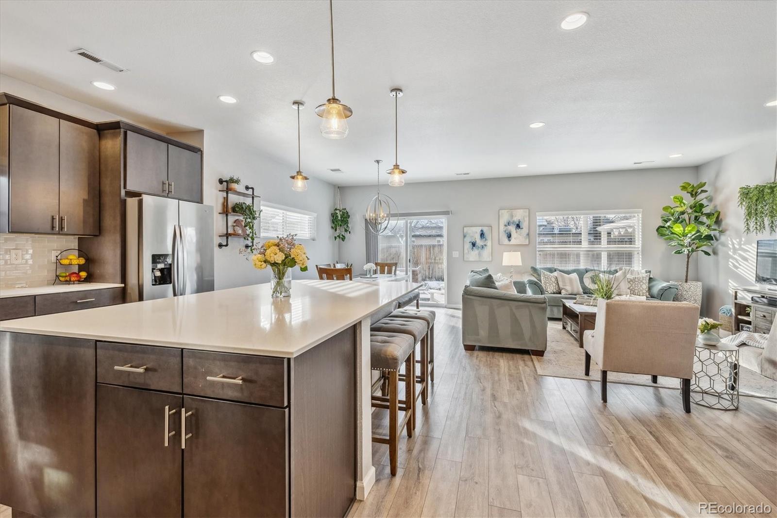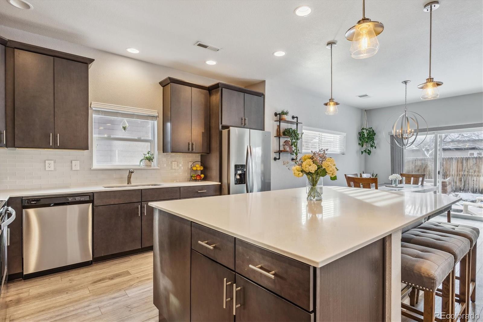 Discover the epitome of modern elegance in this 2017 ranch-style home, nestled in a tranquil Denver cul-de-sac adjacent to open space and a community park. This single-owner residence shines with an open, airy layout, integrating a bright living area, dining space, and a gourmet kitchen with an oversized island and ample storage. Boasting three spacious bedrooms, the highlight is the luxurious primary suite featuring a double vanity and a walk-in closet. Energy-efficient amenities are thoughtfully integrated for eco-friendly living. The home's exterior is just as impressive, offering a private, landscaped backyard with an attached patio and covered seating area, perfect for outdoor dining or entertaining. This home is a unique blend of comfort, style, and convenience, designed for those seeking a balance between quiet living and close proximity to city amenities.
