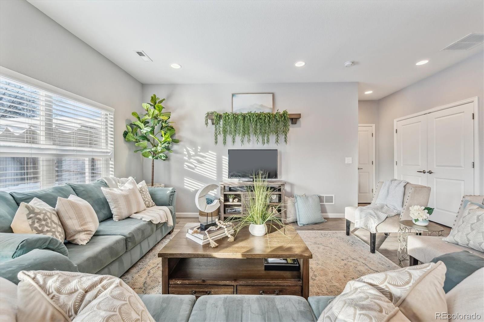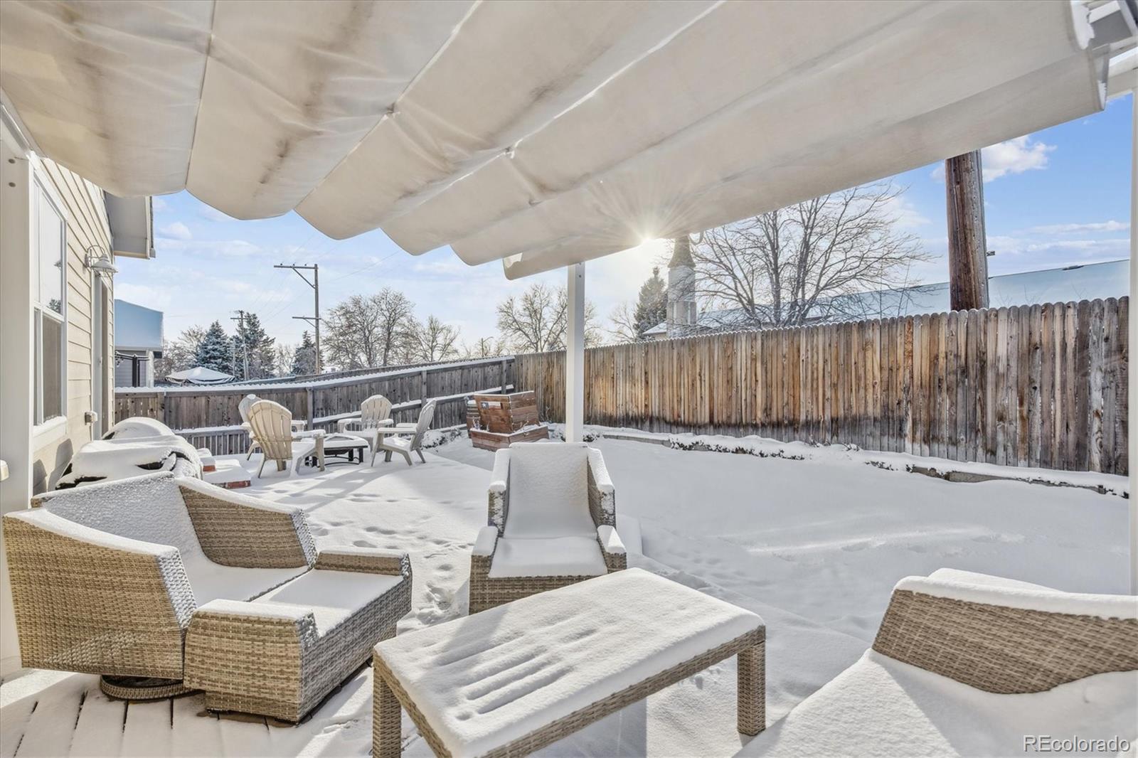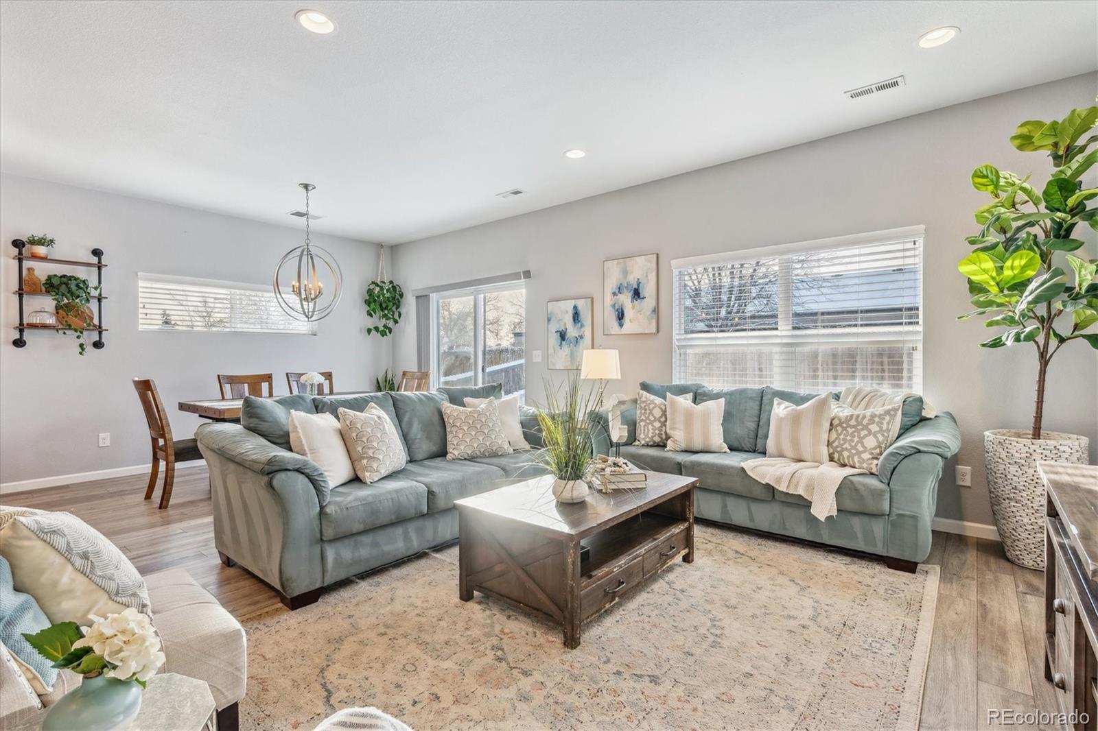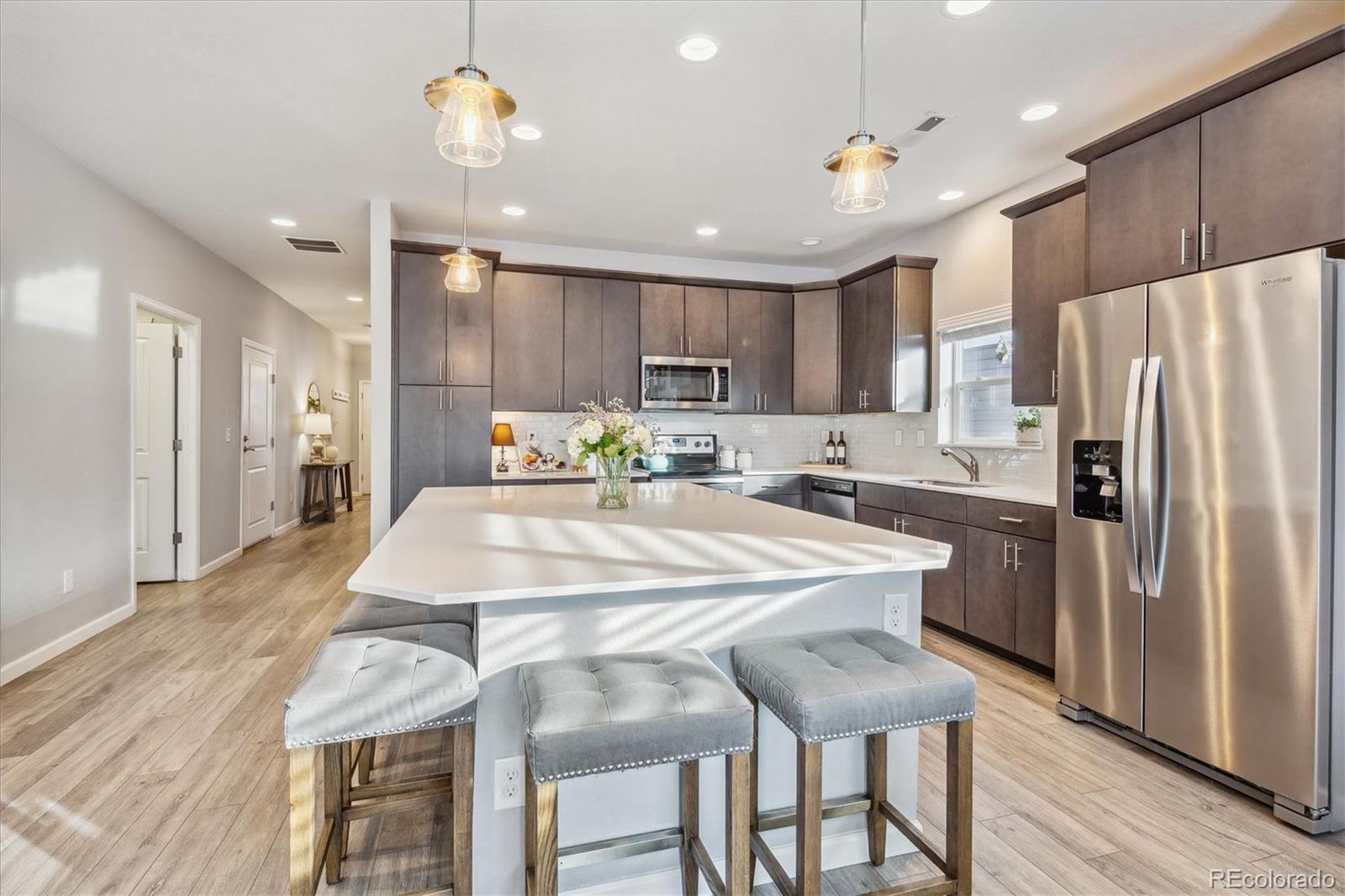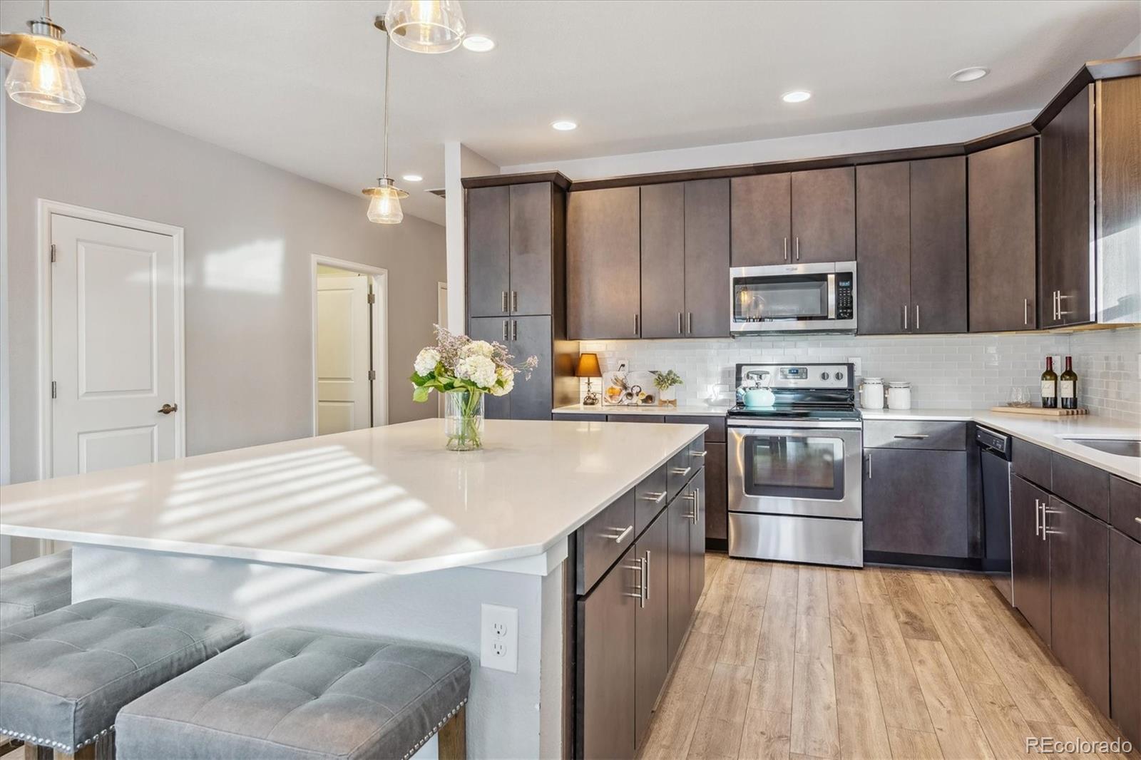 Discover the epitome of modern elegance in this 2017 ranch-style home, nestled in a tranquil Denver cul-de-sac adjacent to open space and a community park. This single-owner residence shines with an open, airy layout, integrating a bright living area, dining space, and a gourmet kitchen with an oversized island and ample storage. Boasting three spacious bedrooms, the highlight is the luxurious primary suite featuring a double vanity and a walk-in closet. Energy-efficient amenities are thoughtfully integrated for eco-friendly living. The home's exterior is just as impressive, offering a private, landscaped backyard with an attached patio and covered seating area, perfect for outdoor dining or entertaining. This home is a unique blend of comfort, style, and convenience, designed for those seeking a balance between quiet living and close proximity to city amenities.