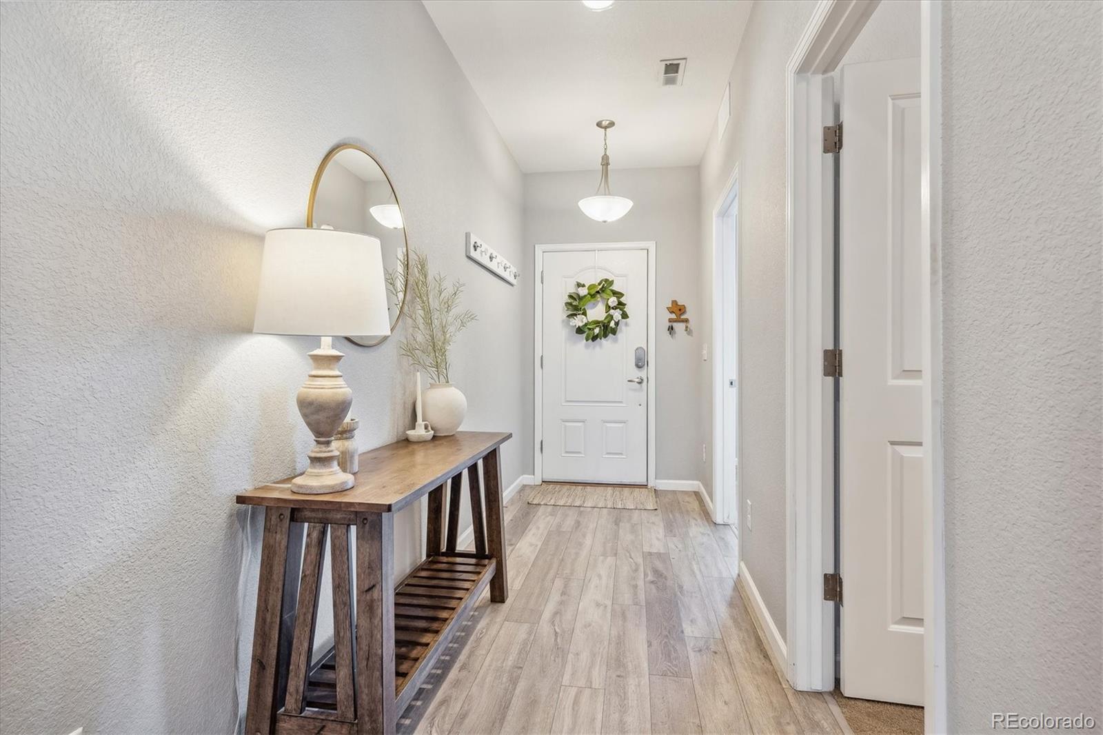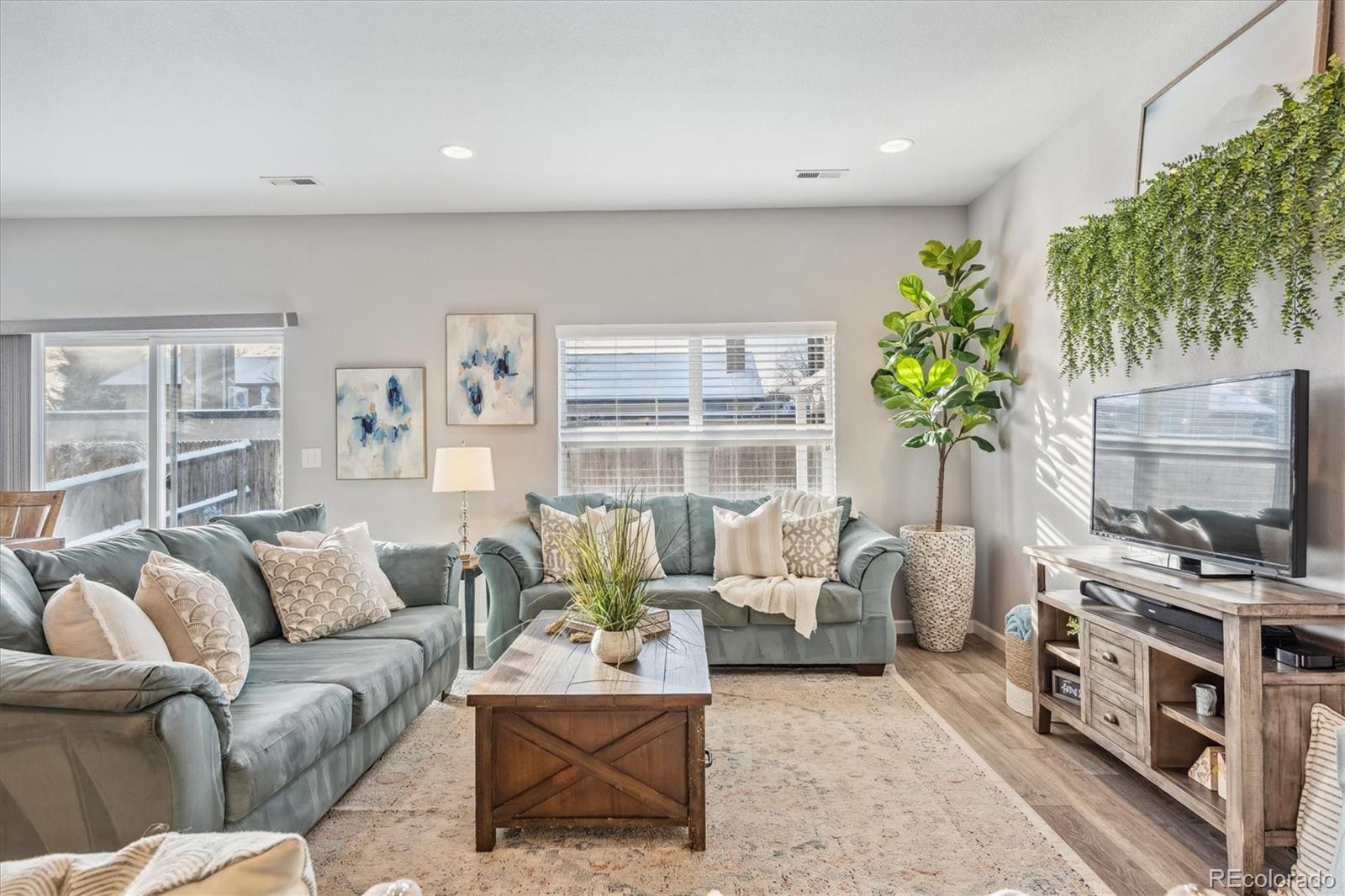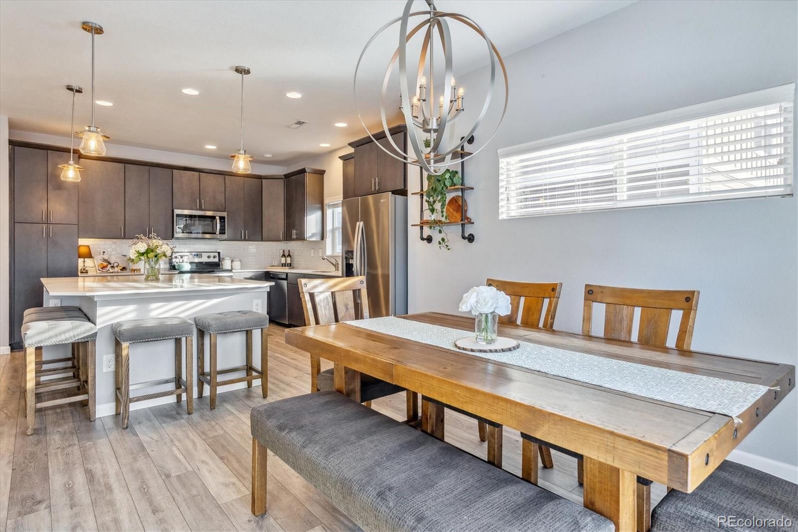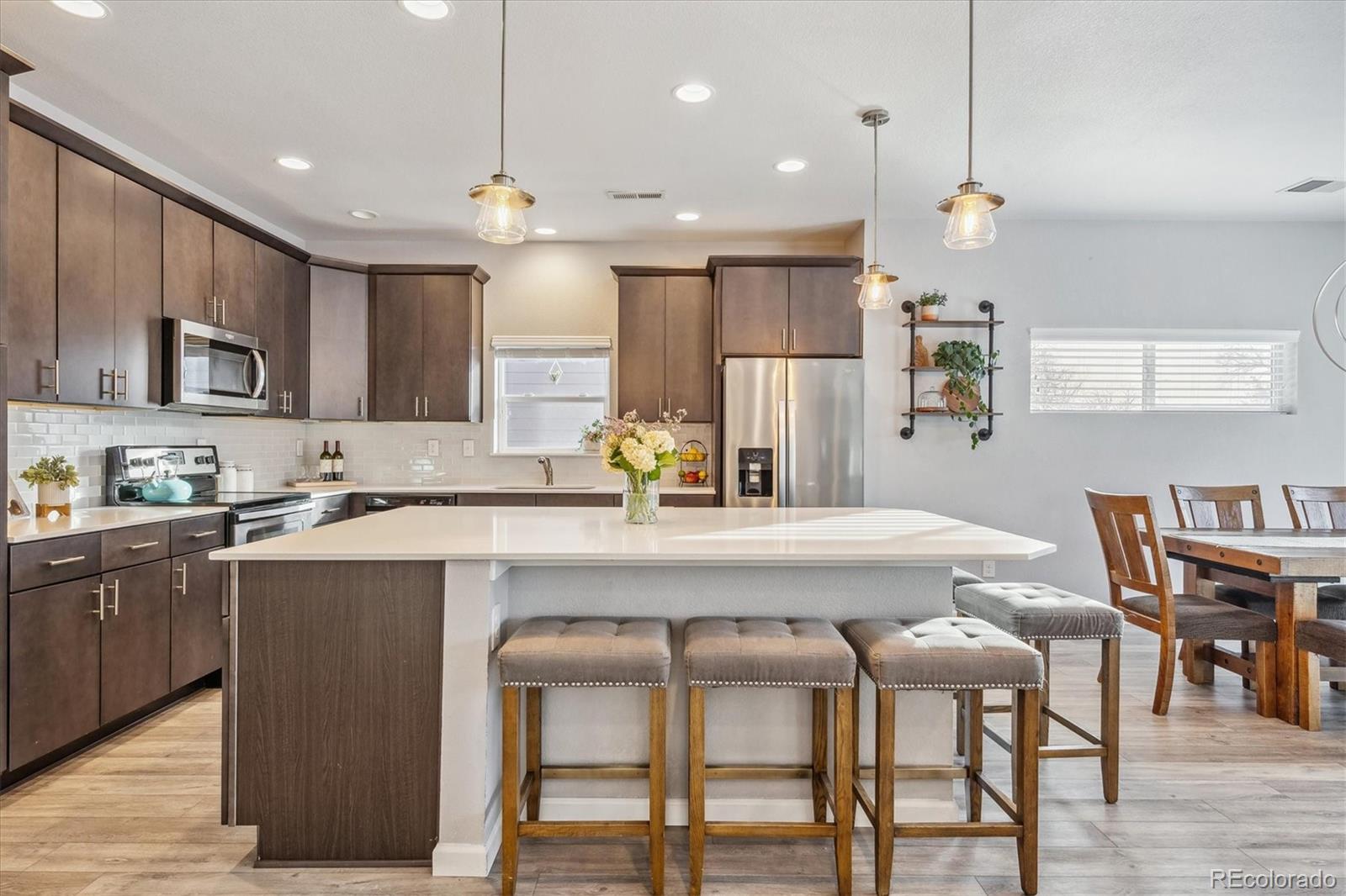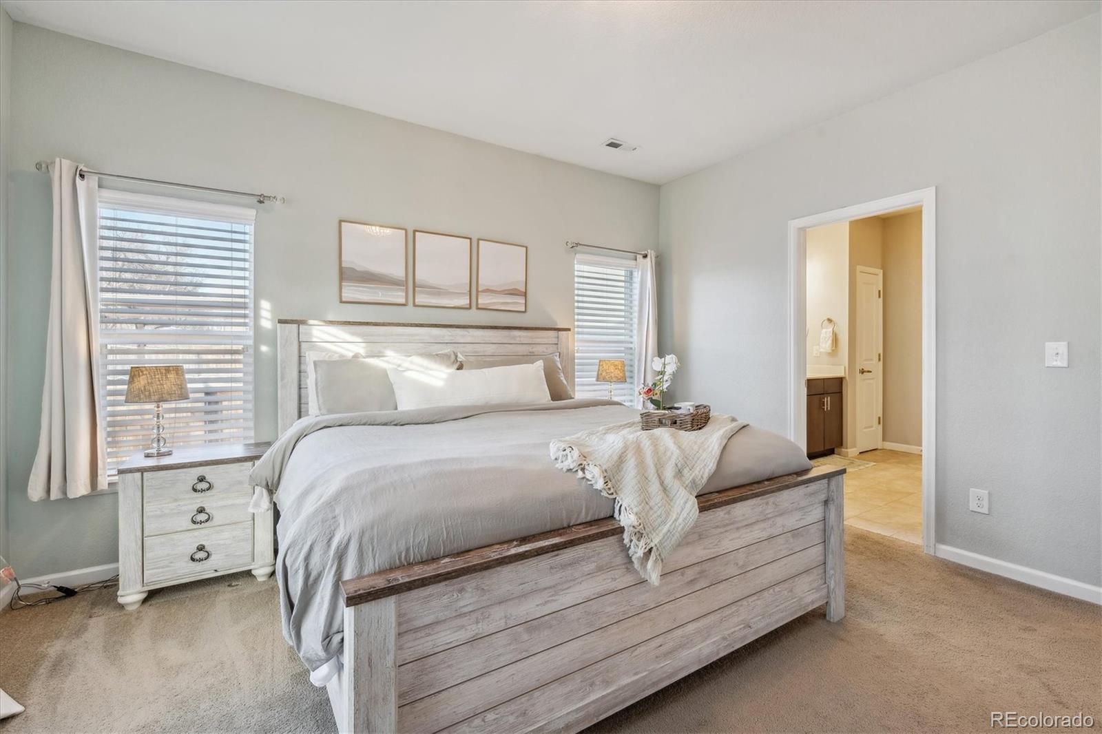 Discover the epitome of modern elegance in this 2017 ranch-style home, nestled in a tranquil Denver cul-de-sac adjacent to open space and a community park. This single-owner residence shines with an open, airy layout, integrating a bright living area, dining space, and a gourmet kitchen with an oversized island and ample storage. Boasting three spacious bedrooms, the highlight is the luxurious primary suite featuring a double vanity and a walk-in closet. Energy-efficient amenities are thoughtfully integrated for eco-friendly living. The home's exterior is just as impressive, offering a private, landscaped backyard with an attached patio and covered seating area, perfect for outdoor dining or entertaining. This home is a unique blend of comfort, style, and convenience, designed for those seeking a balance between quiet living and close proximity to city amenities.