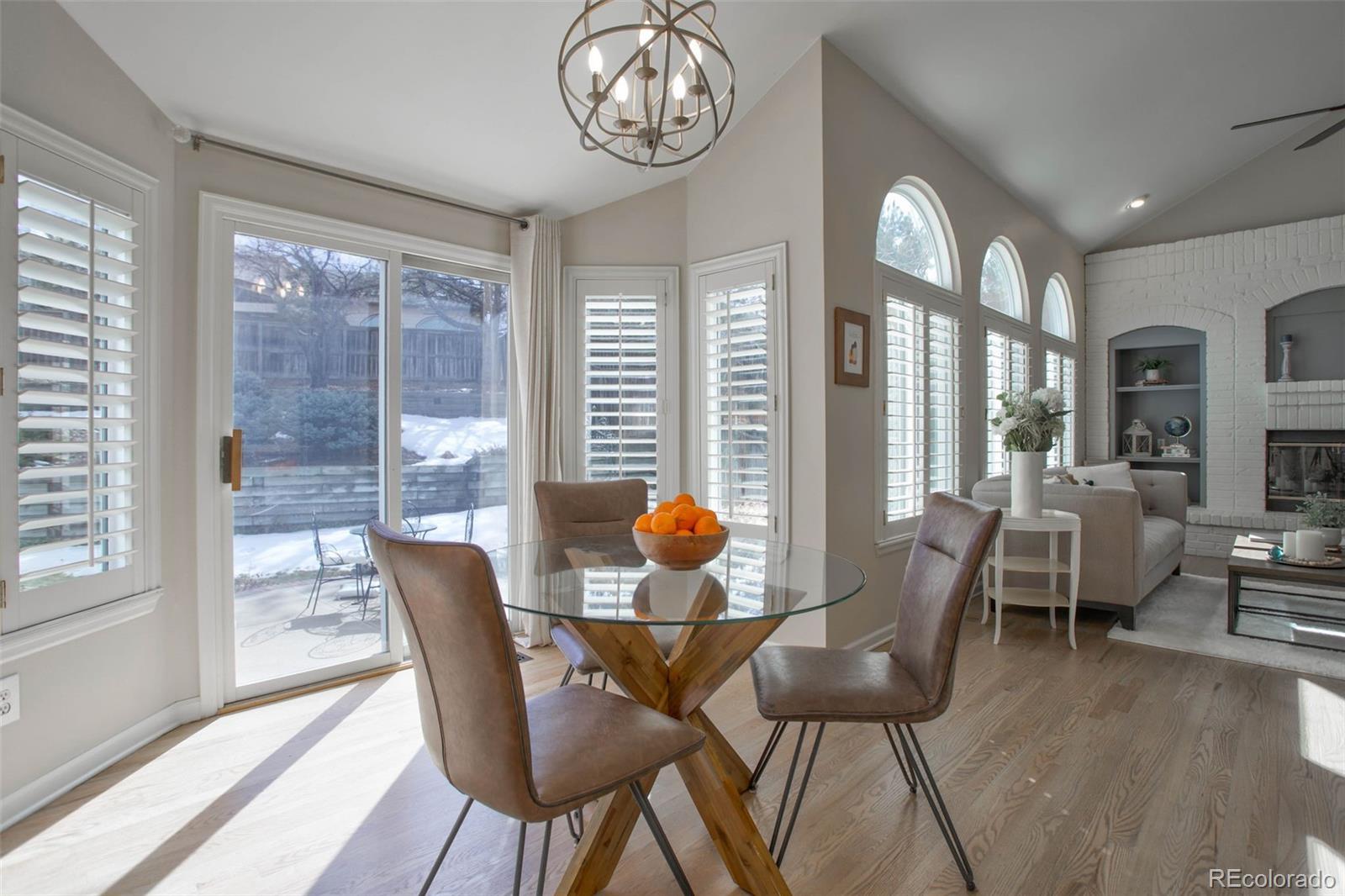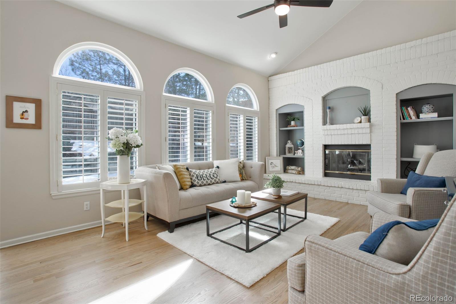 As you enter the family room, you'll be greeted by its impressive vaulted ceilings, hardwood floors, and stylish plantation shutters. The focal point of the room is a striking brick entertainment wall with custom shelving and a gas fireplace. Space is complemented by arched accent windows that invite natural light. Completing the room is a ceiling fan, adding both comfort and style to the space.